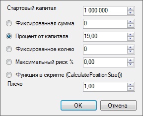 You can choose first two types of position size if you want to backtest your strategy without accounting capitalization – positions will be opened for the same sum or for the same instrument quantity.