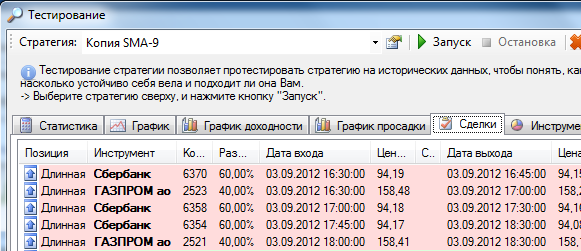 Now let’s backtest our strategy and see the results at the “Trades” tab.